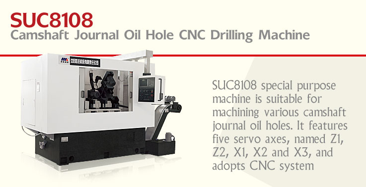 SUC8108 special purpose machine is suitable for machining various camshaft journal oil holes. It features five servo axes, named Z1, Z2, X1, X2 and X3, and adopts CNC system to form a flexible unit. One work-piece can be set up in each cycle and clamped by hydraulic clamping device. The machine consists of bed, guard, cooling system, lubrication system, conveyor, hydraulic system, fixed drilling plate, electrical control cabinet, headstock and slide. It adopts MITSUBISHI control system and AC servomotor. Fast programming and convenient operation, water tank with large flow capacity in cooling system, effective integrated guard and wires in the air, automatic door, as well as specious appearance are features of the machine.