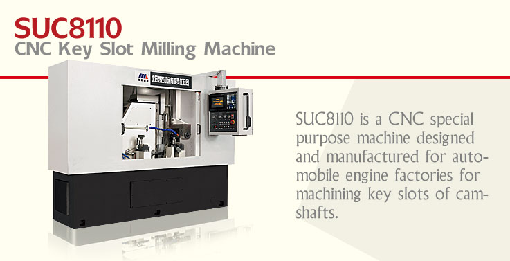 SUC8110 is a CNC special purpose machine designed and manufactured for automobile engine factories for machining key slots of camshafts. The special purpose machine consists of base, column, CNC slide, milling head, clamping device, angular positioning, hydraulic system, pneumatic system, cooling system, lubrication system, tools and auxiliaries, electrical system and machine guard etc. The machine is applicable for machining camshafts of different dimensions with convenient exchange and reliable performance. The required accuracys can be met in one processing, which shows a high productivity and easy accessibility. The machine is guarded completely. The guard door adopts pneumatic control system, which can switch on and off automatically, safely and reliably. The machine is a CNC special purpose machine with comprehensive functions in a compact layout and rational configuration, and features less floor space, specious appearance and easy adjustment and maintenance.